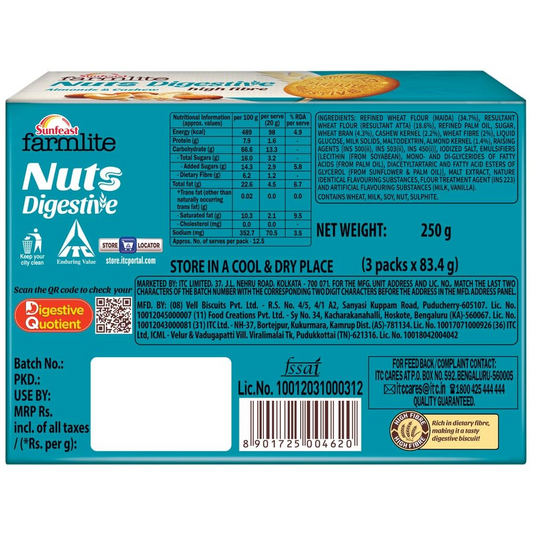 Sunfeast Farmlite Nuts Digestive Biscuit | High fibre | Goodness of Almonds, Cashews and Wheat Fibre, 250g