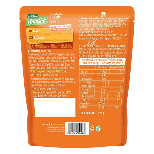 Tata Sampann Yumside Ready to Eat Palak Corn, 285g, Instant Food, Punjabi Style, Ready in 60 Secs