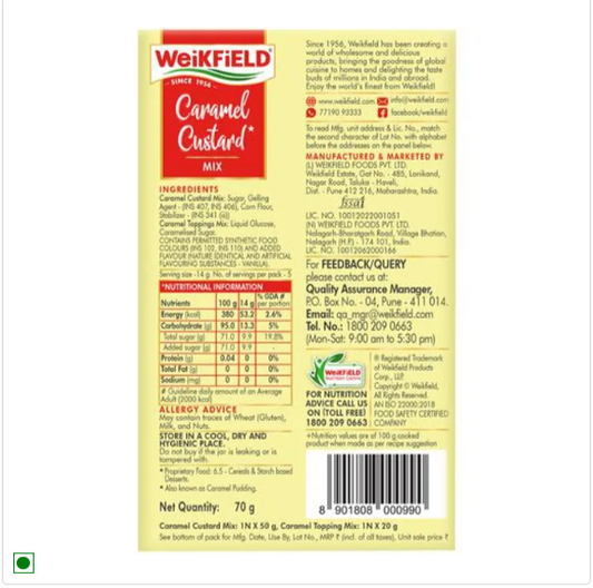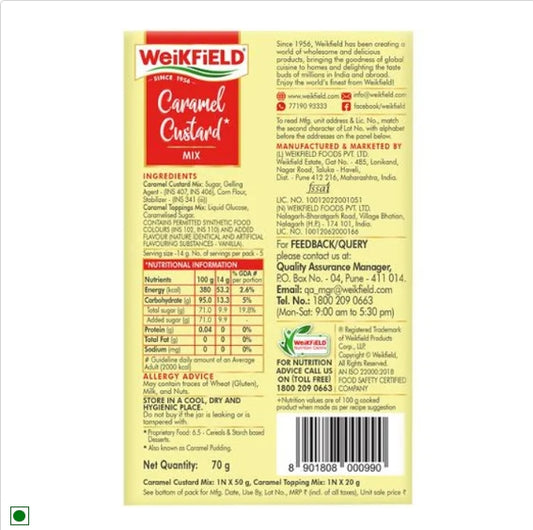 Weikfield Caramel Custard Mix - Caramel Flavor Sets Without Refrigeration - Contains No Eggs, 70 g Carton