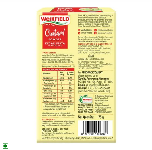 Weikfield Custard Powder - Kesar Pista Flavour, Makes Smooth & Creamy Custard, Contains Quality Ingredients, 75 g Carton