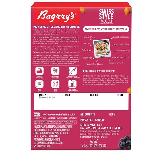Bagrry's Swiss Style Muesli 500gm Box | More than 40% Imported Oats | Honey Dipped Oat Clusters | High Fibre with Added Bran | Source of Protein |