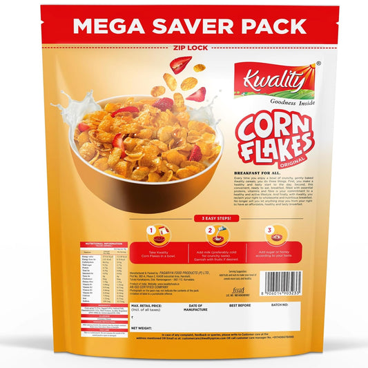 Kwality Corn Flakes 1kg | Made with Golden Corns | 99% Fat Free, Natural Source of Vitamin & Iron | Healthy Food & Breakfast Cereal |l