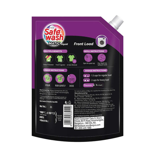 Safewash Front Load Matic Premium Liquid Detergent with Colour-Protect Technology | 2x Stain Removal | For All Types of Fabrics| 2L Refill Pouch
