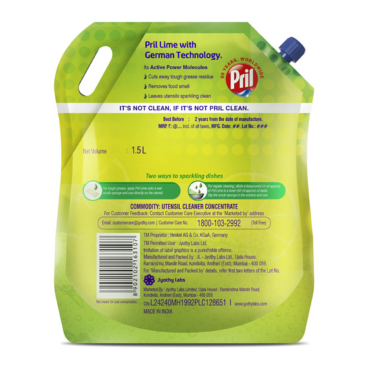 Pril Lime Grease Fighter 1.5 L | Insta Clean | With Active Power molecules that removes grime with ease | Zero White Residue.
