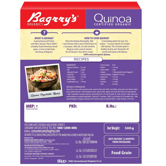 Bagrry's 100% Organic Quinoa 500gm box | Gluten Free | Omega-3 | High in Fiber & Protein | All Natural Quinoa
