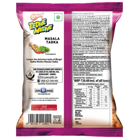 Bingo! Tedhe Medhe Masala Tadka, 90g, Spindle Shaped Crunchy Snack with Indian Masala Flavour Perfect for Snacking
