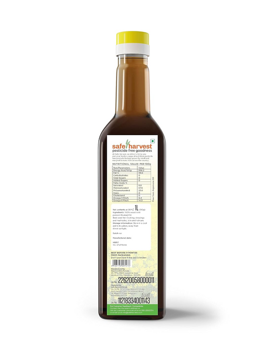 Safe Harvest Pesticide Free Wood Cold Pressed Mustard Oil/Kolhu, 1 Litre High Pungency, Rich in Omega 3 and 6
