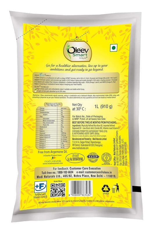 Oleev Smart Oil, Fortified with VIT A, D, E and K, 1L Pouch