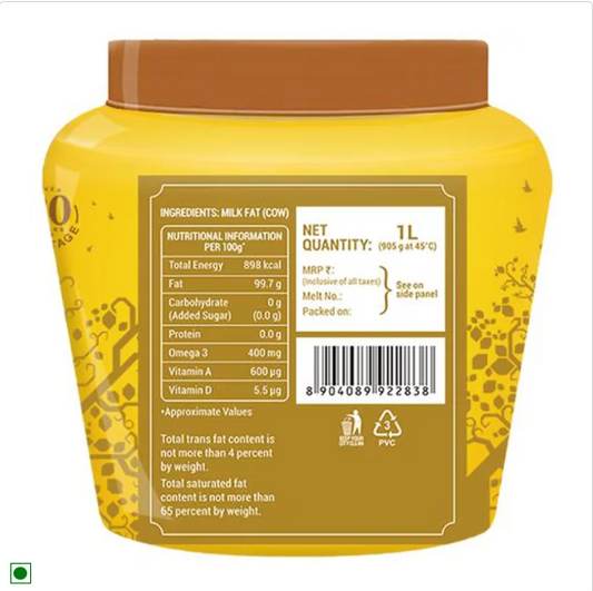 Heritage Buffalo Ghee/Tuppa - Special Grade with Milk Fat, 1000 ml Pouch