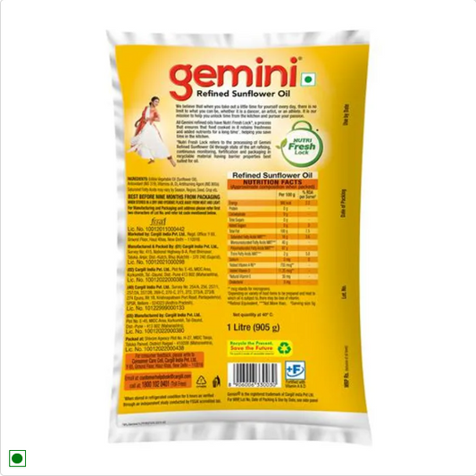 Gemini Refined Sunflower Oil - With Nutri Fresh Technology, 1 L Pouch