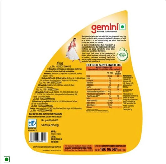 Gemini Refined Sunflower Oil - With Nutri Fresh Technology, 5 L Jar