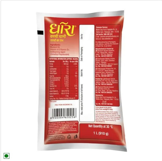 Dhara Oil - Mustard (Kachi Ghani), 1 L Pouch