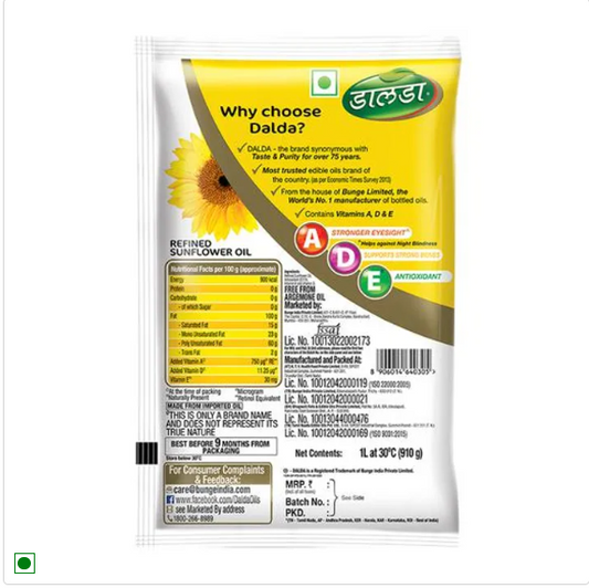 Dalda Refined Sunflower Oil, 1 L Pouch