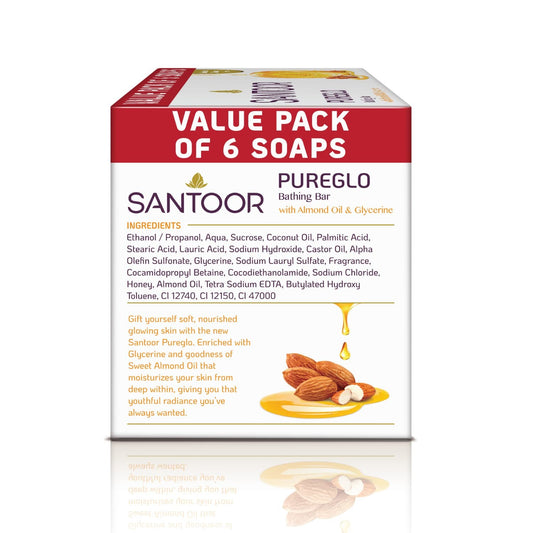 Santoor PureGlo Glycerine Bathing Bar Soap with Almond Oil for Nourished & Glowing Skin| 125g - Pack of 6Gentle & Rich Lathering Formula|